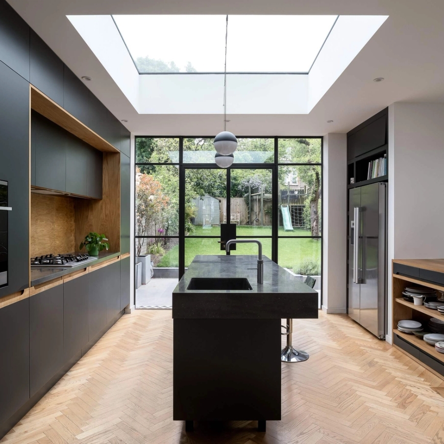 The rear extension also helps zone areas externally as well, creating pockets for activity and entertaining. Externally, the extension is clad in a silver timber and render to create a sleek, but timeless addition to the London brick house. Modern finishes are carried on inside with a bold but seamless black timber kitchen to contrast with the warm parquet flooring. Warm elements are brought in by using London brick to complement the light grey resin floor, creating a considered and interesting family home.