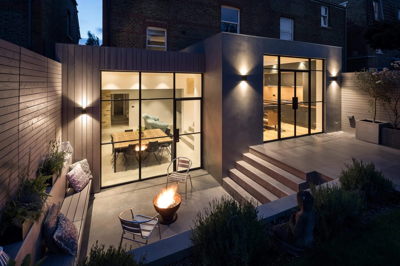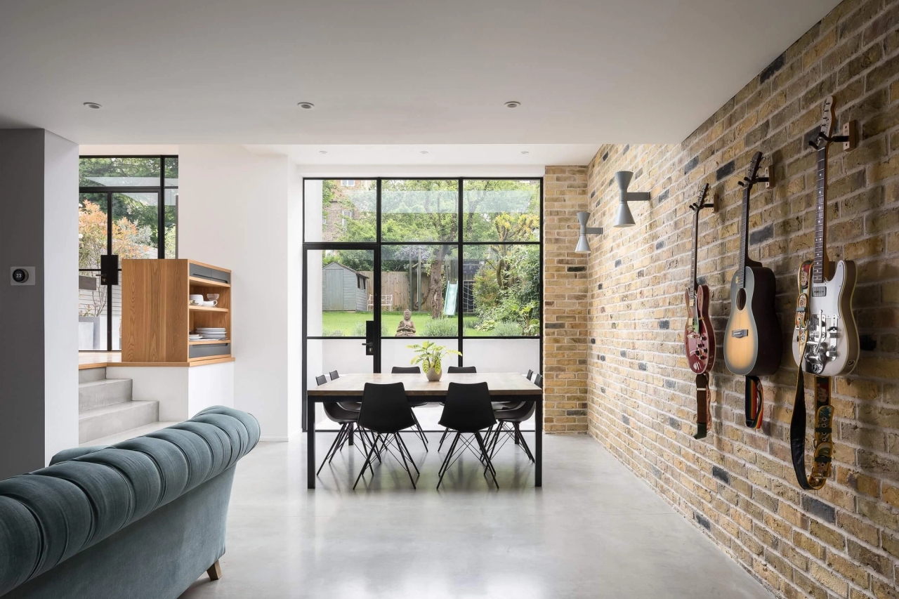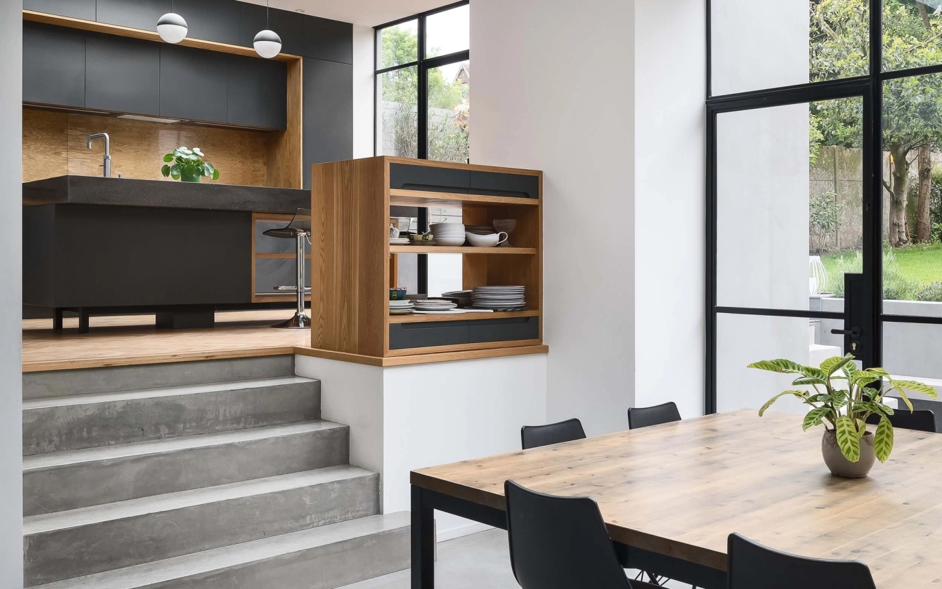 The rear extension and internal reconfiguration at Therapia Rd aimed to provide a better hierarchy of spaces within the house. By playing with levels, informed zones were created to help separate living areas without creating barriers. The rear addition took the idea of a kitchen/living space extension but made it more dynamic, rather than having one large box-like room to the rear of the house. The dining room has high ceilings providing impact and creates a lovely entertaining space. Living room space is located adjacent, meaning it’s tucked sufficiently away for a cosier setting, all while maintaining a connection with outside and the kitchen/dining space.