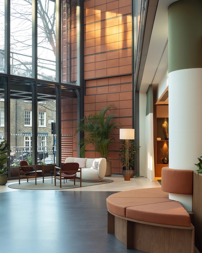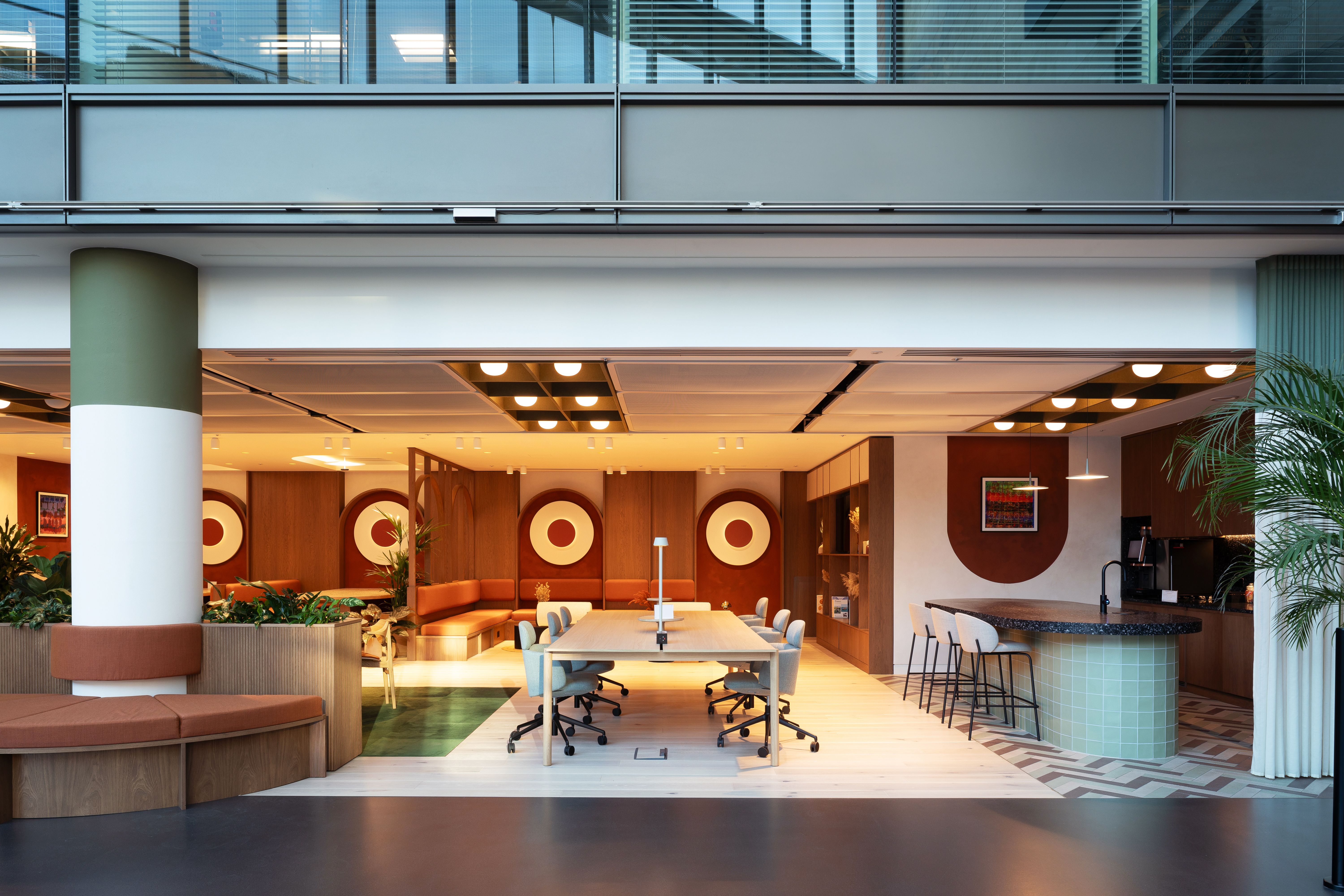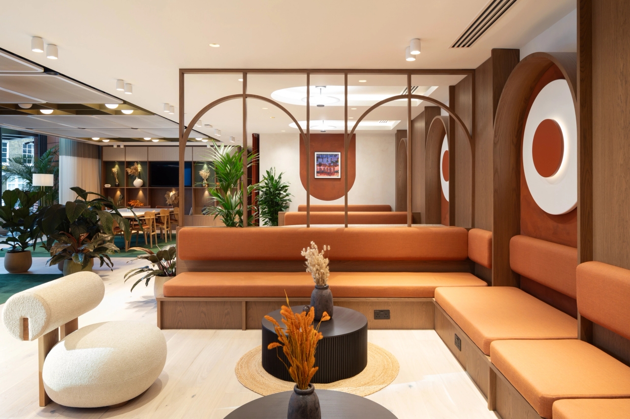 A newly refurbished reception and business lounge designed to enhance flexibility, collaboration, and comfort in a modern workspace. The reception and lounge feature a curated mix of co-working zones, open meeting areas and a new reception desk. This setup offers multiple options for working, meeting, or hosting events. A significant aspect of the design was the removal of existing partitions in the reception area, which creates a seamless flow between the reception and lounge. The space has been thoughtfully designed in line with the client’s broader plans and WELL aspirations, which focus on advancing human health and well-being.