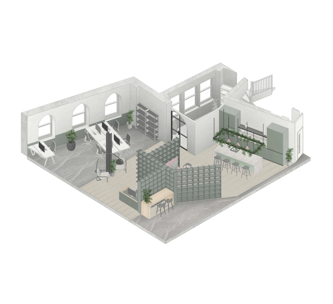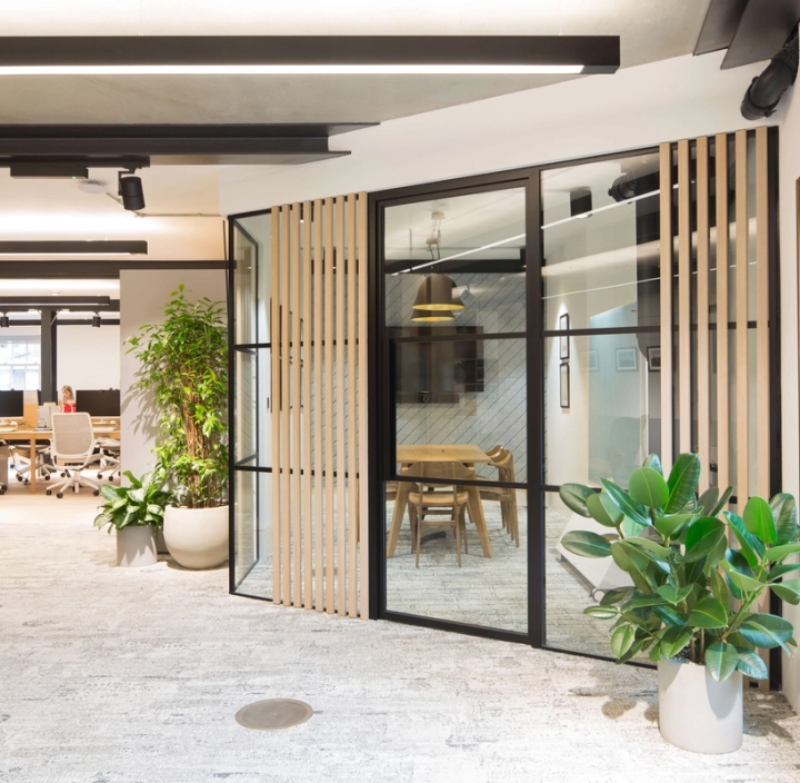 The focus of the scheme was to refurbish and enhance an existing office floor space, providing a fresh and open-plan working environment. Soft neutral tones against a refreshing green palette transform the office floor, with open shelving units dividing the space to zone breakout areas. Key design features include arched glazing partitions in crittall style to replicate the detailing of the existing windows, along with fan coil units sprayed dark green to add interest. A dark gridded SAS ceiling system was also incorporated to uplift the reception and breakout areas, giving a contemporary feel to what once was a traditional office floor plate.