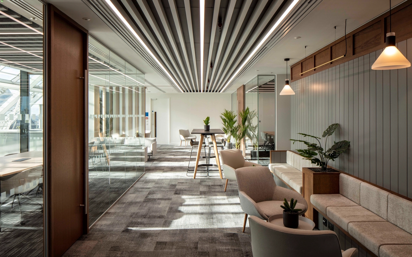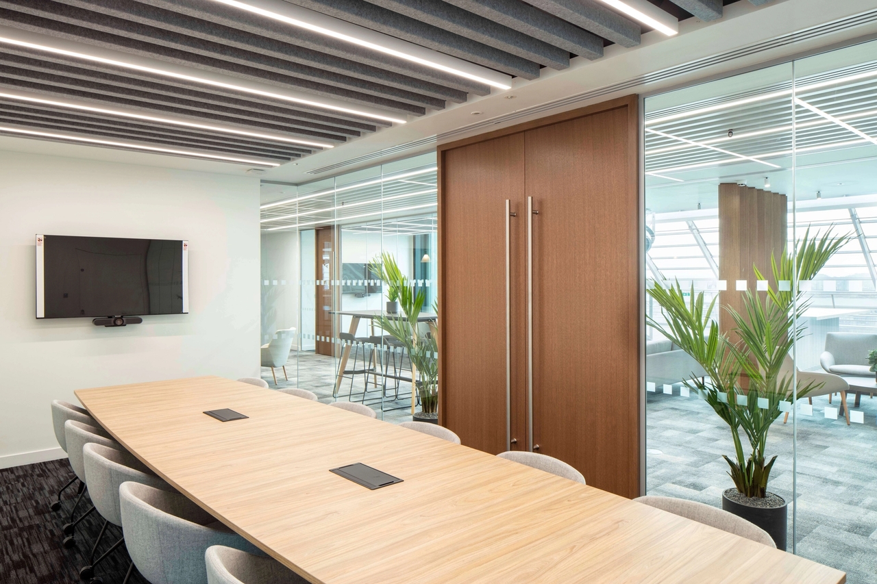 A fit-out project that spanned 3 floors within 70 Mark Lane aimed at refreshing and modernising the existing space. The CAT A floors on the 13th and 15th used light finishes and a perforated metal and strip light ceiling system to allow for future flexibility. The CAT A+ on the 14th floor featured a more bespoke approach with a mixture of meeting and business lounge areas as well as desking.