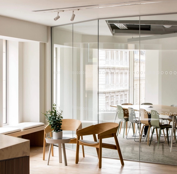 Within the office, floors galvanised circular ductwork and grilles in a repeated formation created a neat and interesting air condition solution, with suspended strip lights set out in a uniform manner. The relocation of the plant onto the roof had allowed enlarged the fifth floor, maximising the floor reformed through large glazed sliding doors.
