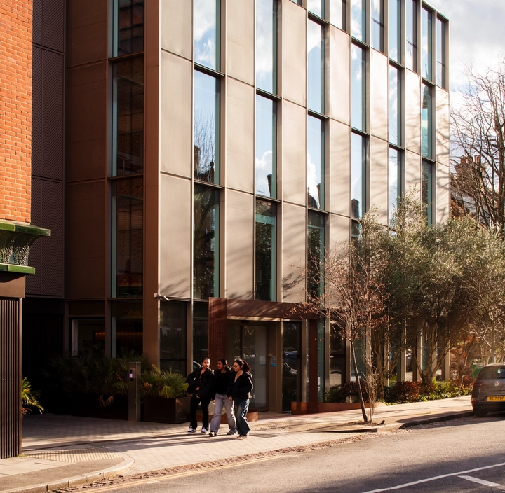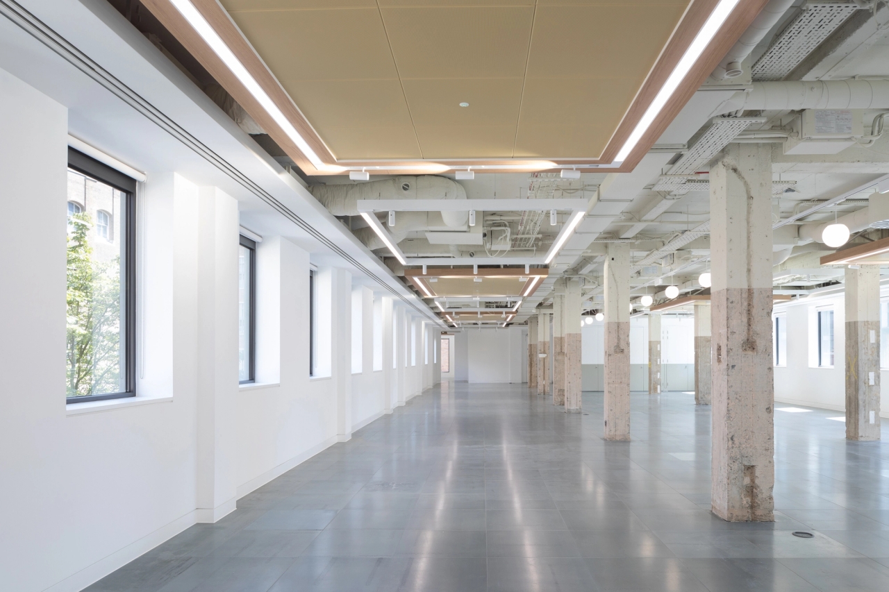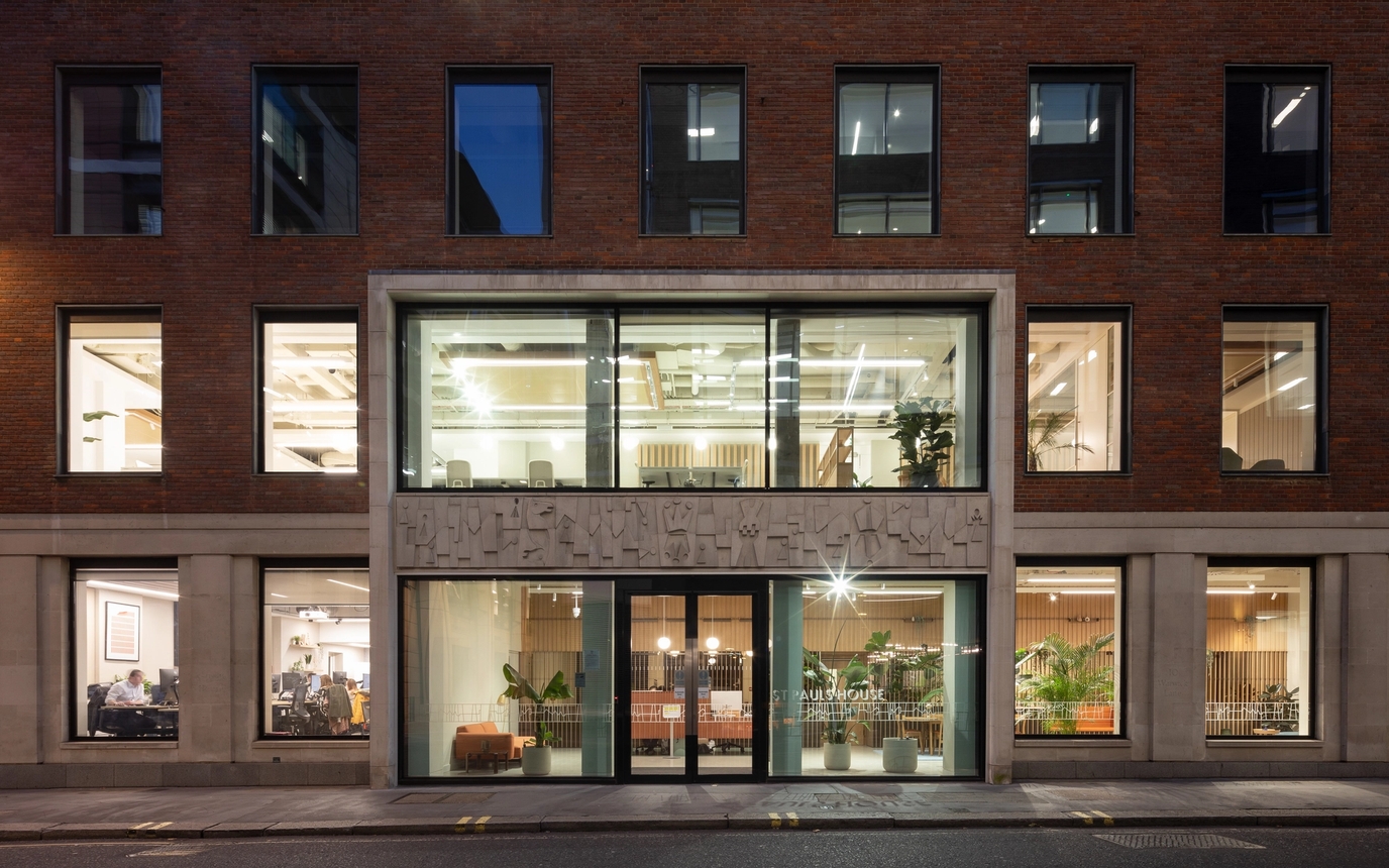 A workspace retrofit at St Paul's House, London. This project enhances the building's existing character while improving the tenant experience through a reimagined entrance, reception, and office space across four floors, along with a new terrace and end-of-trip facilities. At the core of this project was an environmentally responsible approach to design. One of the key components of this was the reuse of the existing metal ceiling tiles. Rather than recycling, we sprayed and reconfigured the tiles into new bespoke rafts which extended their lifetime.