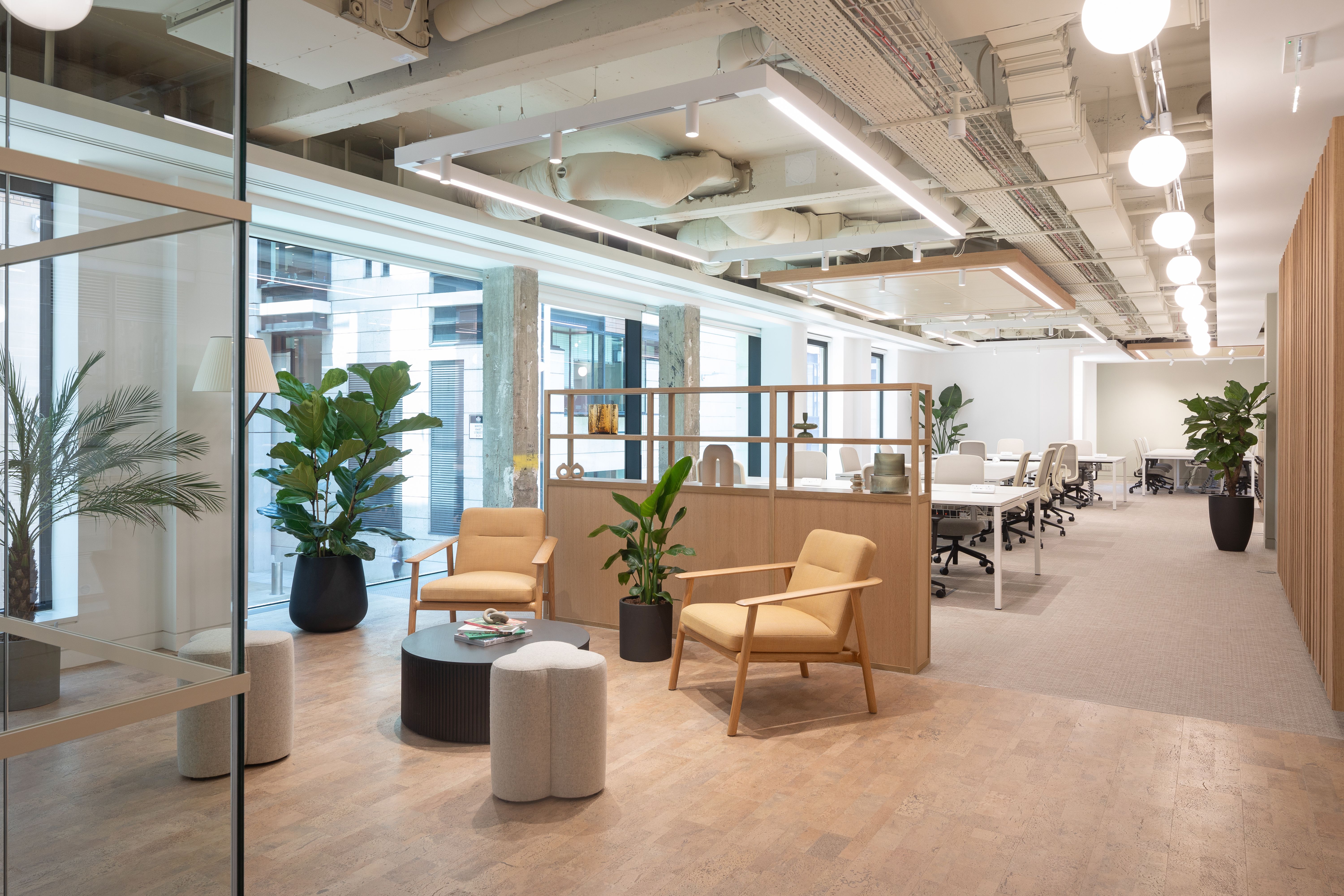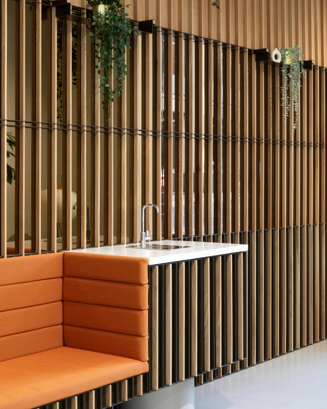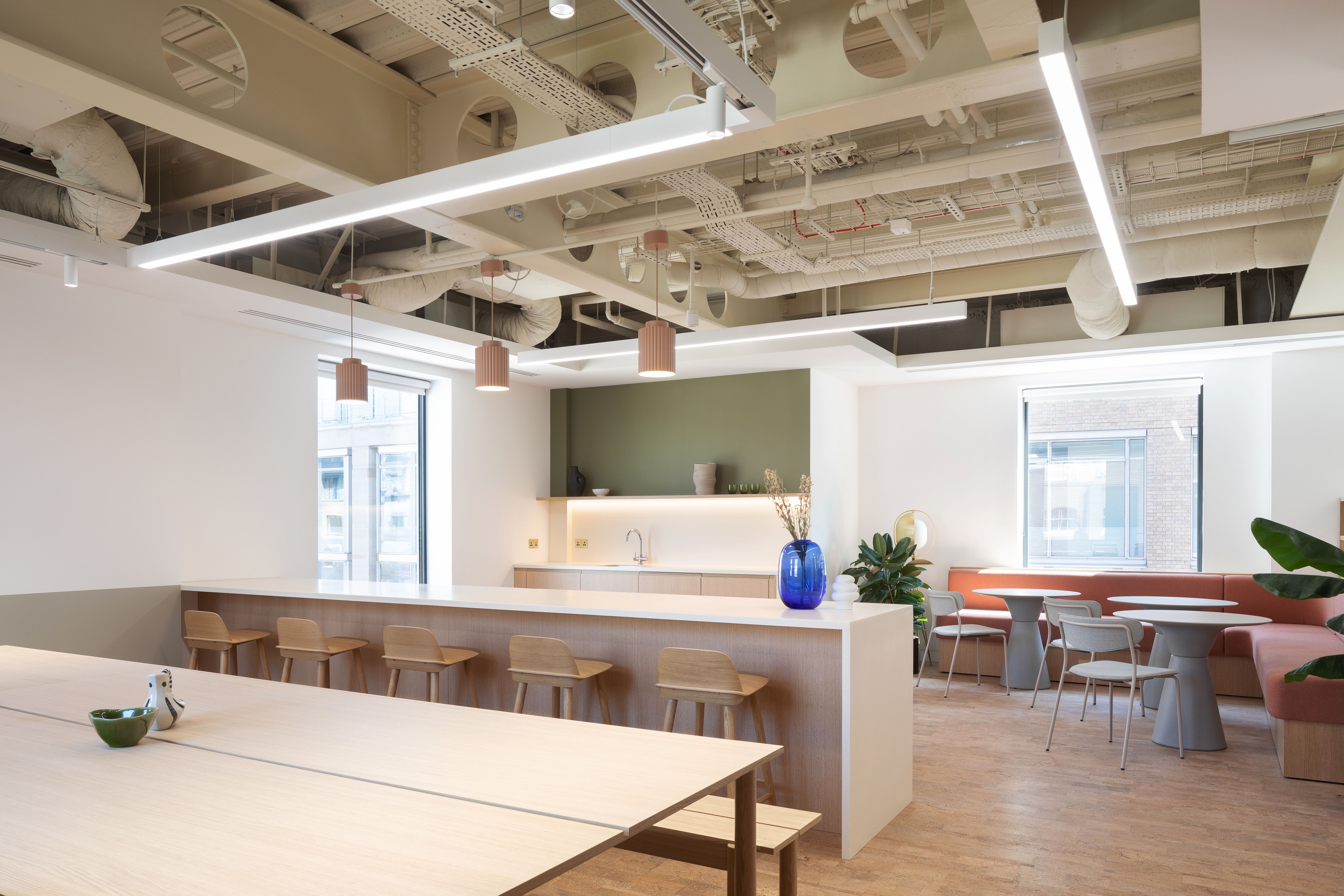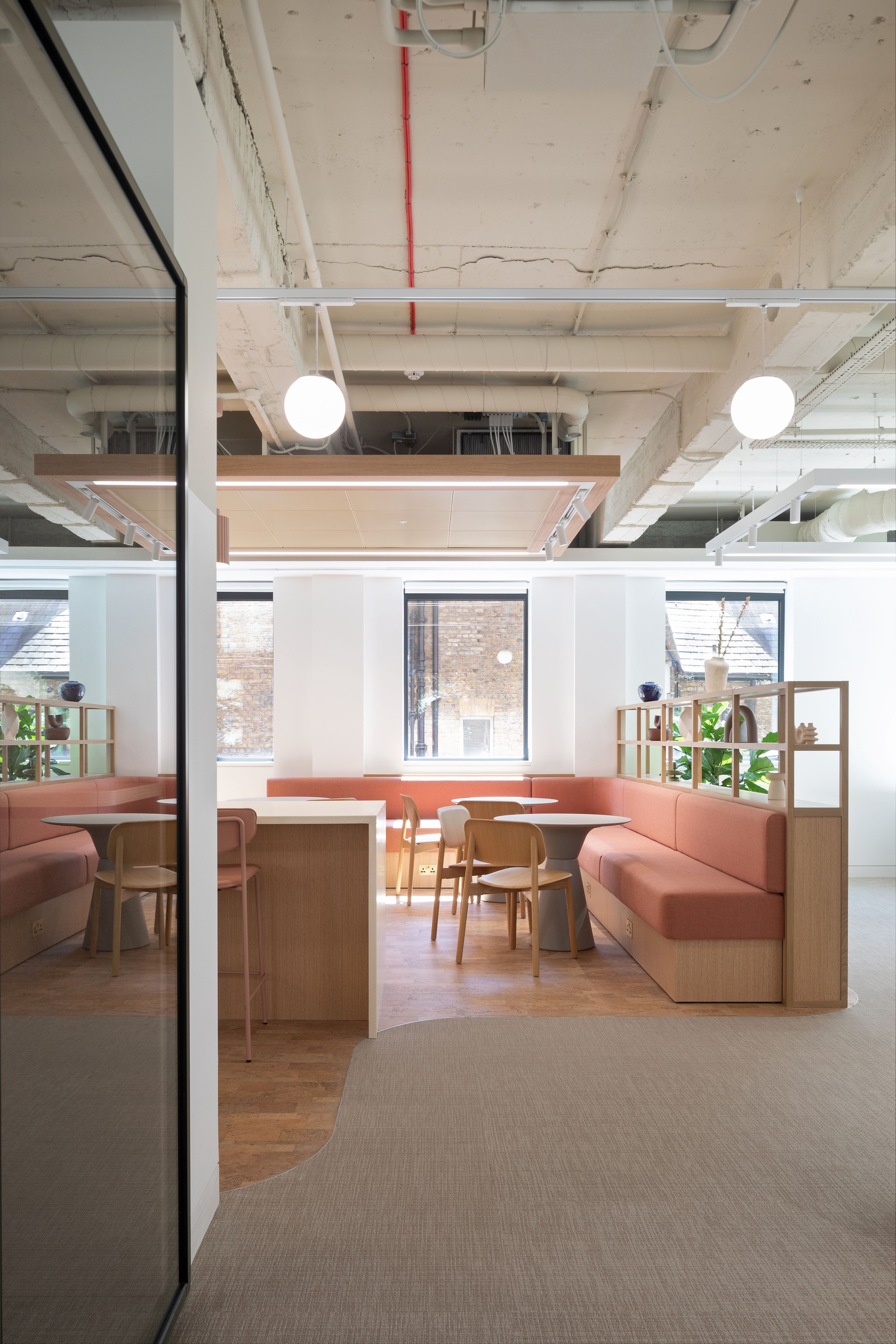 Materiality choices were also key, making use of cork flooring, recycled kitchen worktops and high quality timber furniture with less adhesives - designing for longevity. The use of natural materials throughout the scheme also provides a lovely warmth to the space and reduces VOCs making for a healthier work environment.