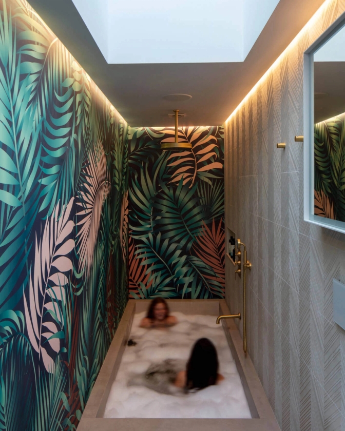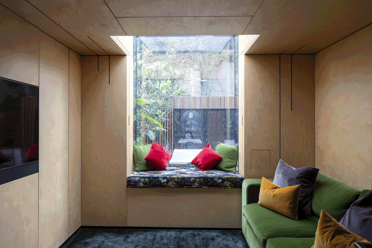 The essence of the scheme was to create the most efficient yet compact spaces to enhance the existing house, utilising every inch of space in practical and dynamic ways. Four inventive design interventions were proposed, including the addition of a narrow slither of two-story extension along the existing driveway had a huge impact on the layout of the house, even at just 1.5m wide. The single bedroom doubled in size and on the ground floor there is now a plywood clad snug that doubles as a guest room, and an impactful bathroom complete with a sunken bath. A traditional loft conversation wasn’t possible due to limited head height, but it was possible to create a mezzanine with a dormer window looking out over the heath, forming a split-level bedroom. The side return utilized dead space in the garden to have a huge impact on the existing galley kitchen, forming a real hub for the house.