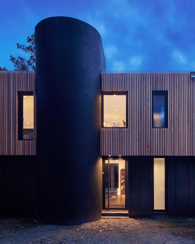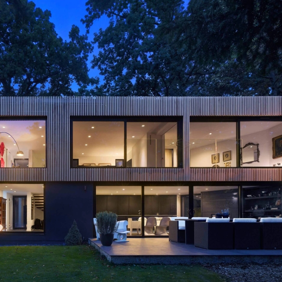 We were also keen to work with the existing valuable features of the house, such as the first-floor lounge and views of the garden. These features were retained and enhanced, the result being a refurbished house with the appearance of a complete new build, achieved in a cost-effective way. Cladding all elevations and replacing all the windows, with different configurations, allowed the property to be insulated, improving its overall thermal performance. The solid black render and metal base to the building with delicate western red cedar strips above creates an interesting composition, contrasting with the existing dark brick house. Post completion the house blends into its tree-lined surroundings with style and subtlety.