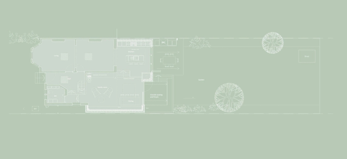 The rear extension and internal reconfiguration at Therapia Rd aimed to provide a better hierarchy of spaces within the house. By playing with levels, informed zones were created to help separate living areas without creating barriers. The rear addition took the idea of a kitchen/living space extension but made it more dynamic, rather than having one large box-like room to the rear of the house. The dining room has high ceilings providing impact and creates a lovely entertaining space. Living room space is located adjacent, meaning it’s tucked sufficiently away for a cosier setting, all while maintaining a connection with outside and the kitchen/dining space.